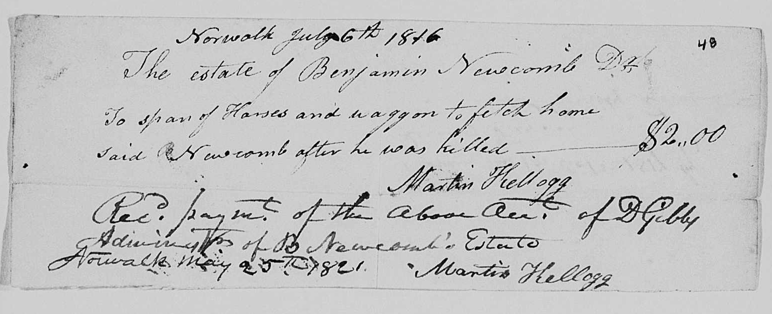 Martin Kellogg charged the estate of Benj. Newcomb $2 for brining his body home from where he'd died. He had to wait 5 years to get his money.